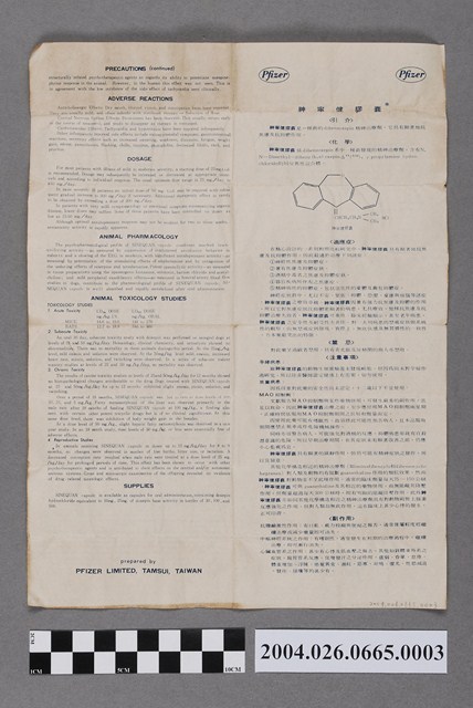 2.根據衛生福利部食品藥物管理署藥物許可證登記所示,此藥適應症:焦慮狀態、憂鬱病。輝瑞(Pfizer Inc.)於1849年在美國紐約成立,於1962年在臺灣設立分公司,臺灣輝瑞大藥廠成為國內第一家申請獲准的外商藥廠,臺灣總公司設於淡水。經查此許可字號有效期限為西元1970-1998年,故此藥物為此時期產物。