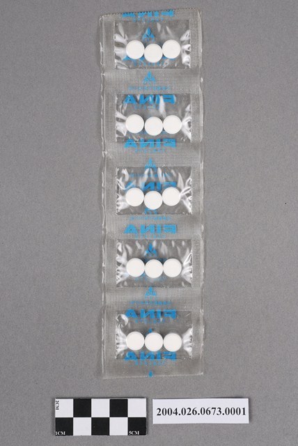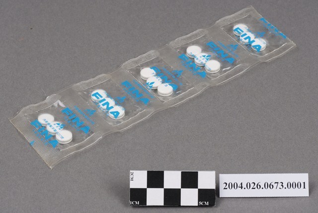 1.本物件為FINA藥錠(中文:胃那錠)。一排藥排有5包,每包內有3顆白色藥片,共有15顆白色藥片。藥片包裝為透明,似塑膠材質,上有藍色字體,可辨識者為FINA字樣。