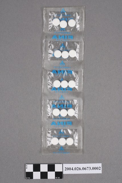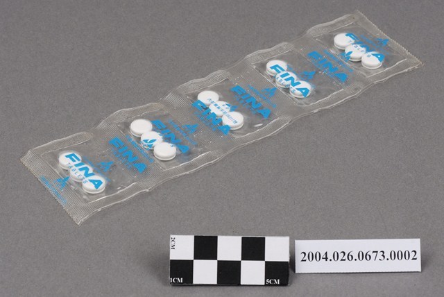 1.本物件為FINA藥錠(中文:胃那錠)。一排藥排有5包,每包內有3顆白色藥片,共有15顆白色藥片。藥片包裝為透明,似塑膠材質,上有藍色字體,可辨識者為FINA字樣。
