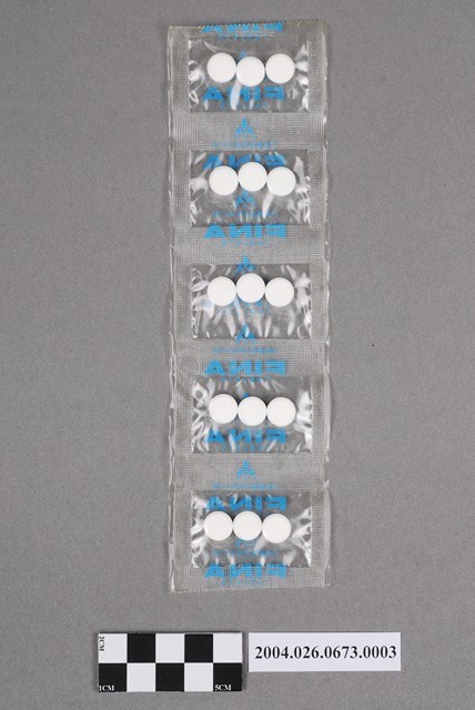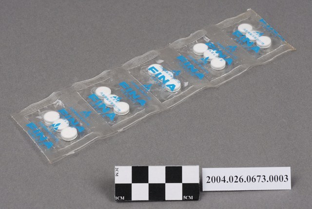 1.本物件為FINA藥錠(中文:胃那錠)。一排藥排有5包,每包內有3顆白色藥片,共有15顆白色藥片。藥片包裝為透明,似塑膠材質,上有藍色字體,可辨識者為FINA字樣。