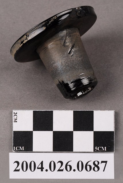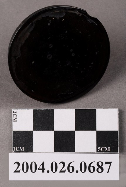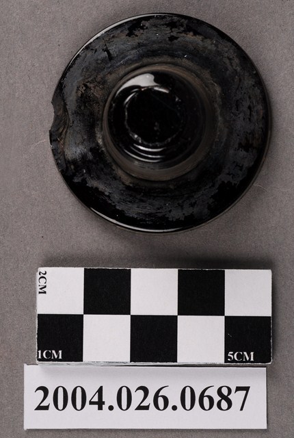 本物件玻璃蓋,細口瓶蓋,茶色玻璃材質。蓋頂有破損,蓋身有刮痕。
