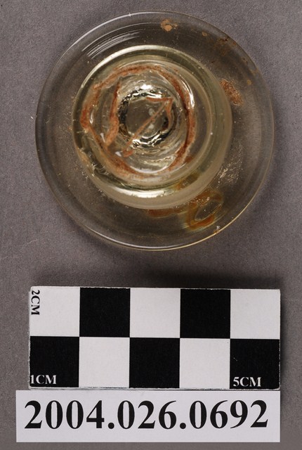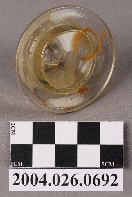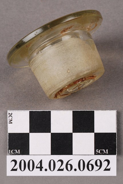 本物件為玻璃蓋,廣口瓶蓋,無色透明玻璃材質。蓋頂有變色,蓋身有破損與變色。