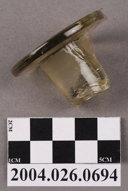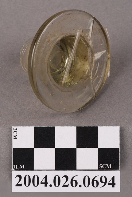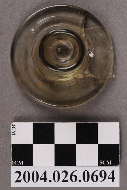 本物件為玻璃蓋,細口瓶蓋,無色透明玻璃材質。蓋頂有裂痕,有透明膠帶黏貼。