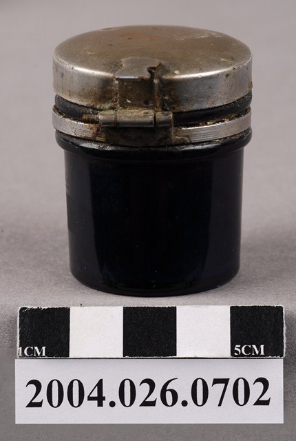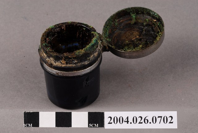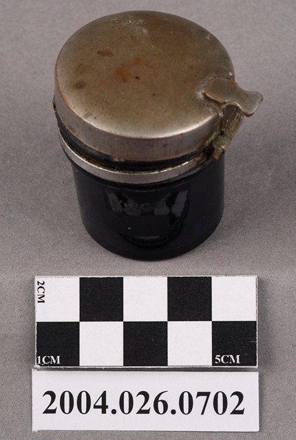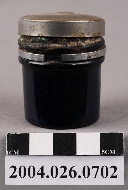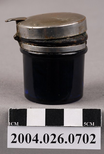本物件為玻璃瓶,深藍色玻璃材質。其上有一銀色金屬蓋子,蓋子略有生鏽。蓋子除了本體之外,連接一金屬環狀物,以金屬軸夾住固定在瓶身,金屬軸夾上扣有突出手壓處,銲接在蓋子上,以開關瓶蓋。瓶身有KING字樣。