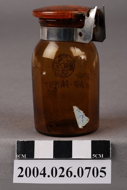 本物件為玻璃瓶,茶色透明玻璃材質。有一蓋子。瓶身上印有商標與文字,商標為十字型,其上文字有PROSE和プ ス,瓶身另有P.A. PATENT等白色字樣。瓶身與蓋子以一金屬環狀物連接,環狀物尾端延伸出L型,L型有兩個洞在上,其中一洞穿有鐵絲。