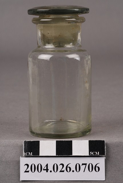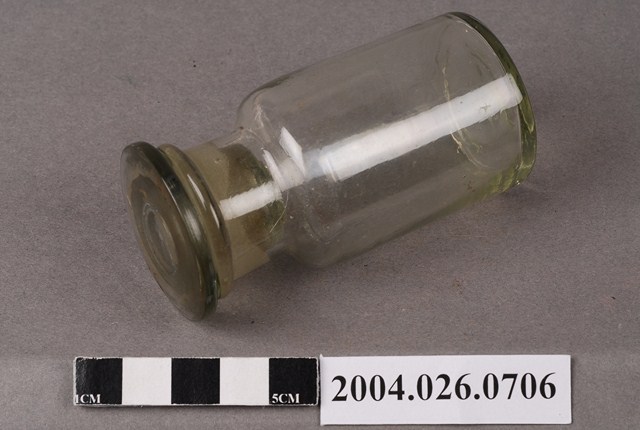 本物件為玻璃瓶,廣口瓶。瓶身與瓶蓋是無色透明玻璃材質。瓶身與瓶蓋可分開。