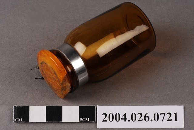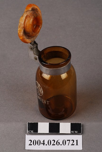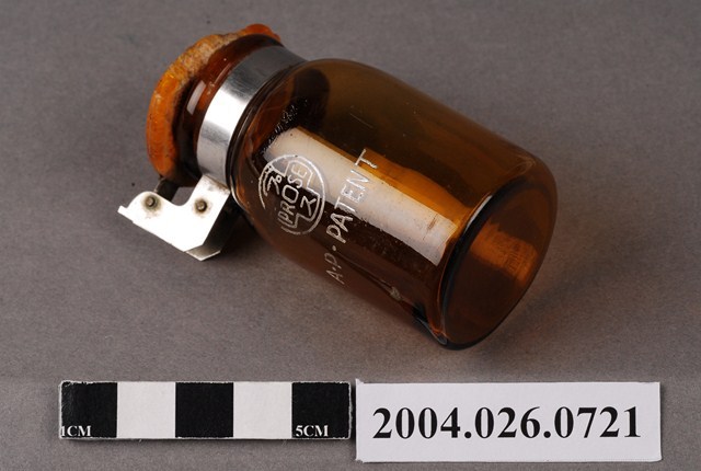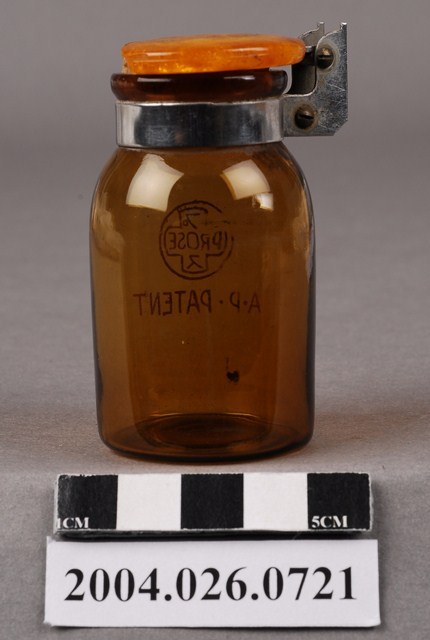 本物件為玻璃瓶,茶色透明玻璃材質。有一蓋子,有破損。瓶身上印有商標與文字,商標為十字型,其上文字有PROSE和プロス,瓶身另有P.A. PATENT等白色字樣。瓶身與蓋子以一金屬環狀物連接,環狀物尾端延伸出L型,L型有兩個洞穿兩根金屬軸,將金屬環狀物夾住固定於瓶身,也扣有一卡榫插入瓶蓋。