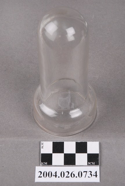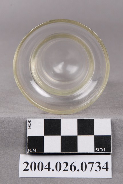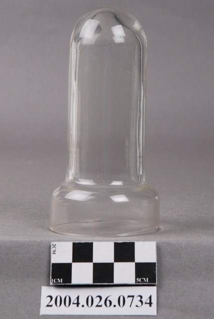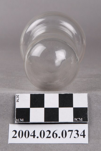 本物件為玻璃容器。無色透明玻璃材質,無蓋,底部呈圓弧型。一般是置於醫療器械置物架上。