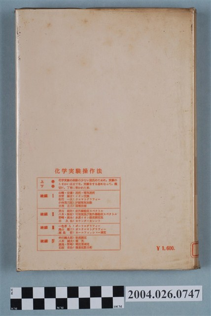 本物件為緒方章等編《化學實驗操作法》,封面封底為白色精裝,封面以紅色印有共同編輯及續編Ⅳ篇章編寫之作者,顯示此本為續編第四篇,並於封面下方印有出版商「南江堂」字樣封底以紅色印有全套化學實驗操作法之內容、作者,於右下則印有此本書的價格為日幣1600圓,內文共有「粘度測定、螢光、電位差滴定、微量扩散分析」四章。