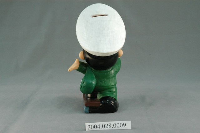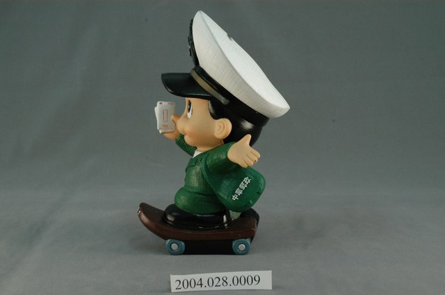 1.本物件為2001年郵政男娃娃。整體構造為一個穿著綠色郵政制服及戴著有郵政符號帽子的短髮娃娃且左腳踩著滑板。娃娃右手上拿著信件、左手肩背著郵政包,雙手呈現向上張開的動作,包包上印著中華郵政四個字;滑板部分為咖啡色,前方印著「2001」的字樣;帽子後方有設置投錢孔,娃娃整體為一個存錢筒。