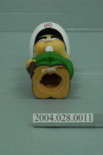 1.本物件為郵政爺爺。整體構造為一個穿著綠色郵政制服及戴著有郵政符號帽子的白髮娃娃。娃娃臉上戴著眼鏡有皺紋及白鬍子、右手拄著拐杖、左手背在身後,娃娃背後印著「福」的字樣;帽子後方有設置投錢孔,娃娃整體為一個存錢筒。