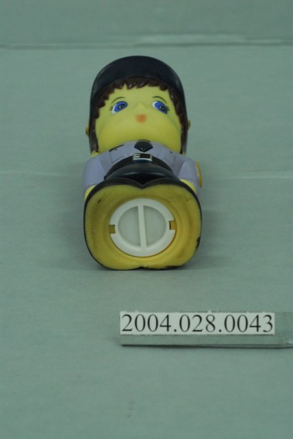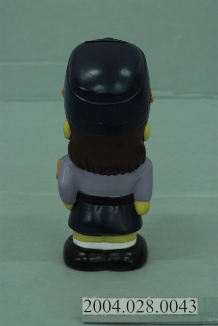 本件以穿灰衣藍裙的女警察為形象,製作而成的娃娃,上有投幣孔,可作為撲滿使用。
