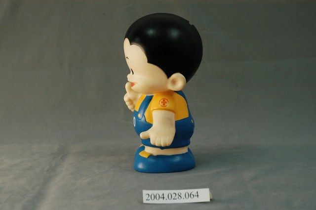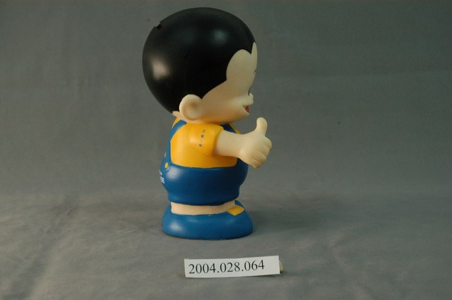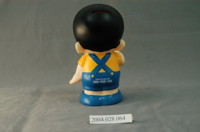 1.本物件是小男孩造型的存錢筒娃娃。娃娃有黑色波浪狀短髮,大大的嘴巴微開;右手往前伸直做出讚的手勢;身著黃色短袖上衣及藍色吊帶短褲,右手袖子印有藍字「第一銀行」,左手袖子印有紅色的第一銀行1982年版標誌,褲子正面上有白色「100」數值;腳穿1雙藍色鞋子;娃娃背面褲子上印有白字「消費者貸款服務熱線」、「080-000-106」。