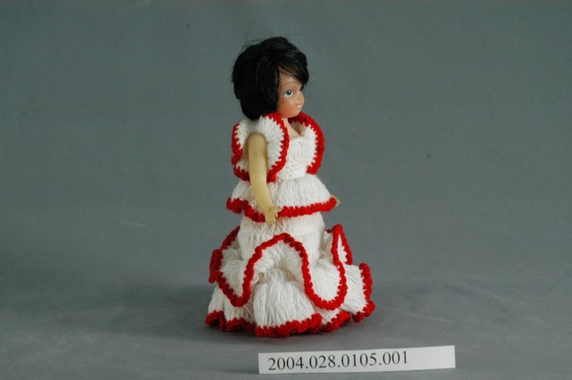 本文物為洋娃娃,身穿紅邊白毛線編織而成的洋裝,裙襬設計為波浪式,髮型為耳際短髮,臉部膚色偏黑,在嘴唇、下眼線都有塗上些許顏色,作為妝點。可從文物得知,當時女性的髮型與服裝樣式。