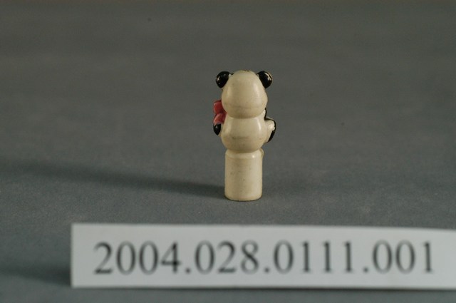 本文物為鉛筆及卡通造型筆套一組。鉛筆為圓柱形鉛筆,白色筆身,上有藍色點,沒有削。筆套造型為黑白熊貓的立體形像,上面有粉紅色點點。