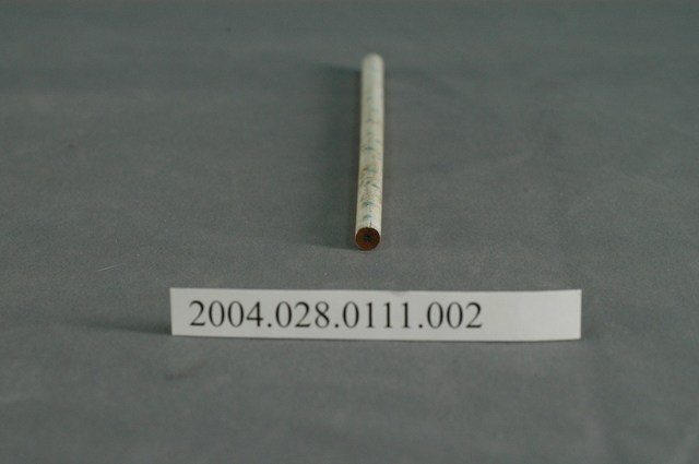 本文物為鉛筆及卡通造型筆套一組。鉛筆為圓柱形鉛筆,白色筆身,上有藍色點,沒有削。筆套造型為黑白熊貓的立體形像,上面有粉紅色點點。
