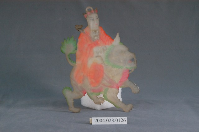 1.本物件為文殊菩薩大型尪仔仙,造型為戴五佛帽,騎銀色麒麟,身著橘色袈裟,一手持如意,另一手則握住麒麟耳朵。