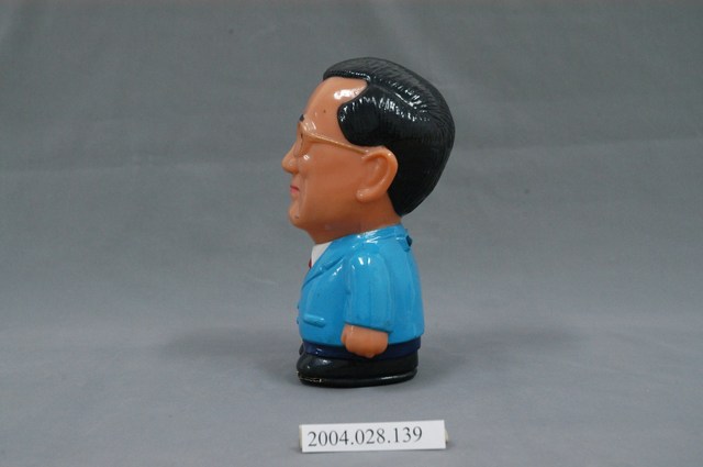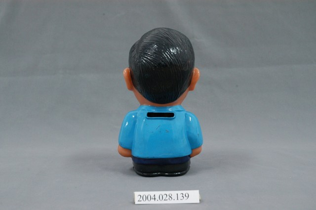 此為一塑膠製公仔存錢筒,公仔人物為2000年代表中國國民黨參選的總統候選人連戰。 此物件為臺灣2000年的第10任總統選舉相關商品,此次選舉為臺灣自1996年後第二次由全民直接參與投票的總統、副總統選舉。此次選舉中,中國國民黨的代表為連戰、蕭萬長,民主進步黨的代表為陳水扁、呂秀蓮,另有從國民黨脫黨參選的宋楚瑜、張昭雄,從民進黨脫黨參選的許信良、朱惠良,新黨也於此次選舉派出李敖、馮滬祥參選,此次選舉陳水扁及呂秀蓮當選,造成臺灣歷史上第一次的政黨輪替。