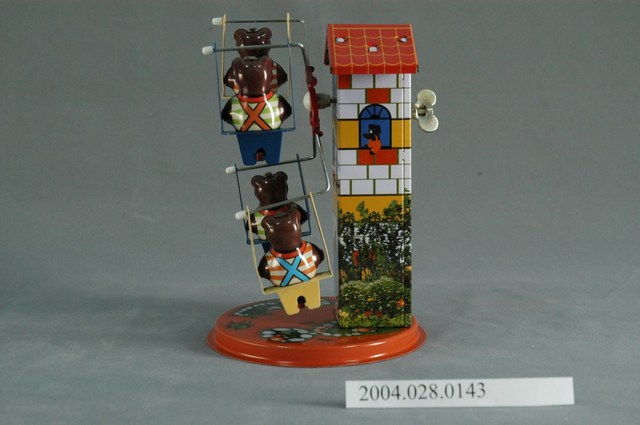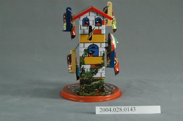 1.本物件為房子與四隻小熊之鐵皮玩具,金屬材質。該鐵皮玩具外觀為一幢高度為三樓的房子,房子外部有四隻小熊懸吊於空中,房子底部有一個圓形底座。房屋外觀為白、藍、黃、綠、紅色,四隻小熊為咖啡色、身著條紋衣物,底座為橘紅色。其物件背面可見一個發條。