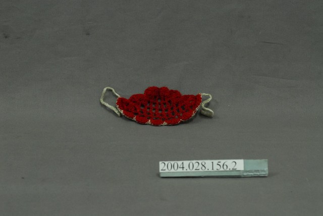 本文物為身穿白邊紅毛線洋裝的洋娃娃帽子,由白邊紅毛線編織而成的圓弧帽子,與洋裝做搭配,帽子兩端有著白色細繩,可綁於下巴,固定住帽子。可從文物得知,當時女性的服裝配飾。