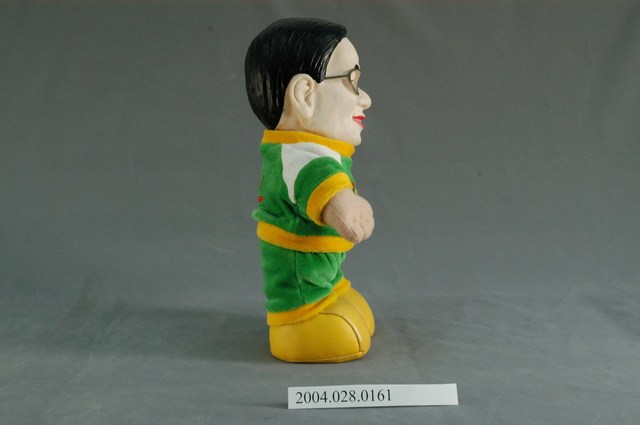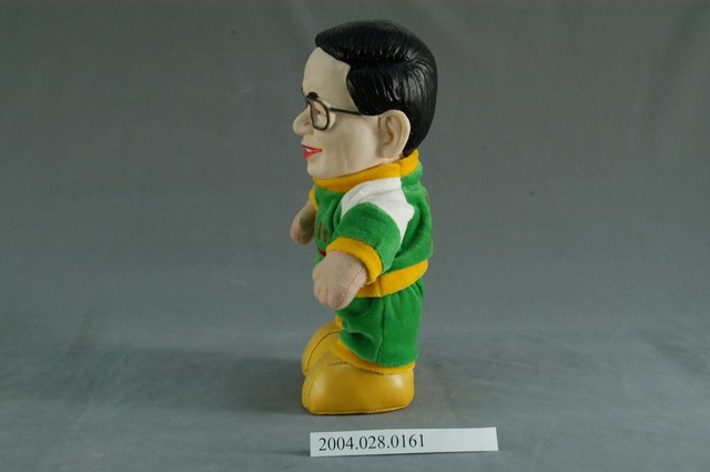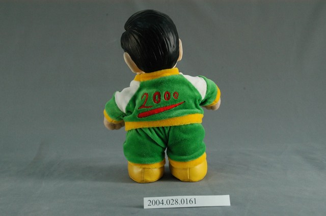 此為一公仔娃娃,公仔身著以綠色為主色調的運動服,胸口則寫有「2000」的字樣,此公仔為民主進步黨籍總統參選人陳水扁在2000年總統大選的紀念公仔。 此物件為臺灣2000年的第10任總統選舉相關商品,此次選舉為臺灣自1996年後第二次由全民直接參與投票的總統、副總統選舉。此次選舉中,中國國民黨的代表為連戰、蕭萬長,民主進步黨的代表為陳水扁、呂秀蓮,另有從國民黨脫黨參選的宋楚瑜、張昭雄,從民進黨脫黨參選的許信良、朱惠良,新黨也於此次選舉派出李敖、馮滬祥參選,此次選舉陳水扁及呂秀蓮當選,造成臺灣歷史上第一次的政黨輪替。