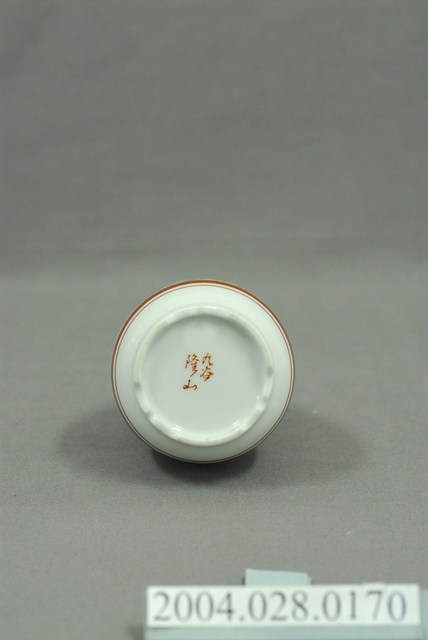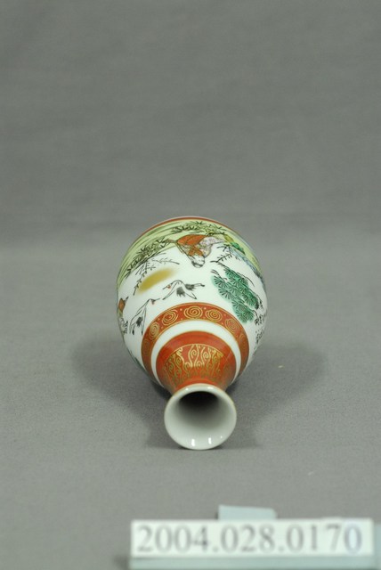 1.本文物為松圖案酒器,其材質為陶瓷,白色系,無提把,只有一往上之開口,瓶身為水滴狀,以白瓷為基底,並於上頭附上以松為題之圖案和搭配之文字,酒瓶頸部為黃底鑲金條紋飾,瓶底有「九谷隆山」紅字,應為九谷燒之意。