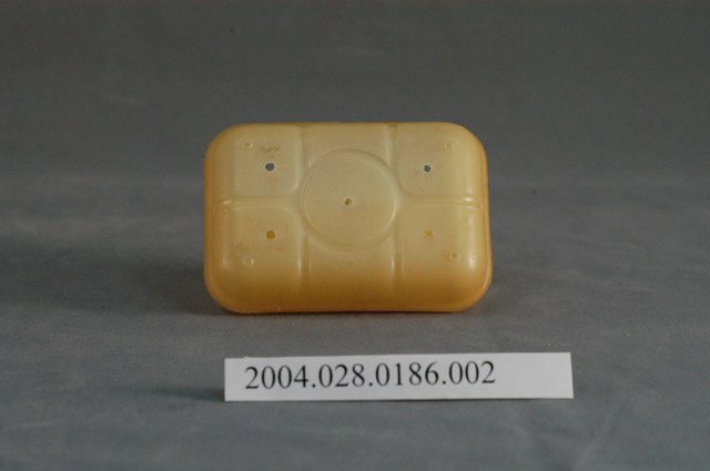 1.本件盒身為黃色塑膠製肥皂盒部件之2,長10公分,寬7公分,高2.4公分。盒身通身以塑膠壓模製作,外型呈現長方形扁盒狀,其四端角略帶弧形轉角。底面帶有2道直線,1道橫線將盒蓋均分成6等分之壓紋,並於各等分中央處作圓形透孔,其四端腳帶有小型半圓球形支腳。2.本件肥皂盒主要放置肥皂或香皂之清潔用品。臺灣早期傳統使用壓榨茶油時所剩下來的渣滓,再把它壓製成堅硬的餅形,稱之為「茶箍」,又或者使用無患子進行衣物清洗或身體清潔。1920年代後肥皂的使用量逐漸增加,至1930年代普遍出現在臺灣日常身體清潔的使用。