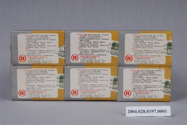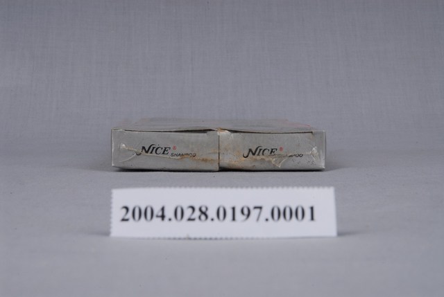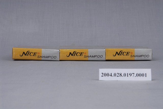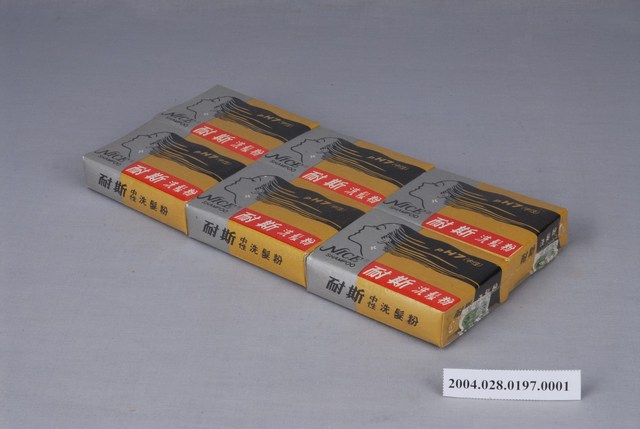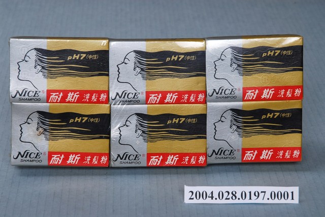 本文物為耐斯洗髮粉,6盒為一組,每盒5小包,盒上封面、側邊都註明中英文字的「耐斯洗髮粉」,圖像部分有位烏黑秀髮的女子,展現女性使用耐斯洗髮粉後的美麗與風采。外盒背面寫有洗髮粉的優點、使用方法以及產品資訊,強調為中性洗髮粉,能去除頭皮屑,並保持頭髮光澤性,是當時重要的民生用品。