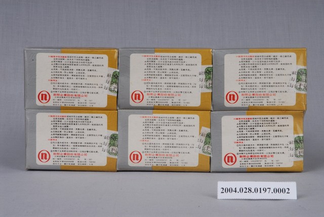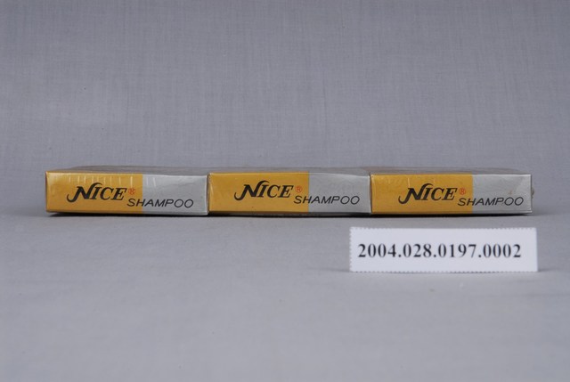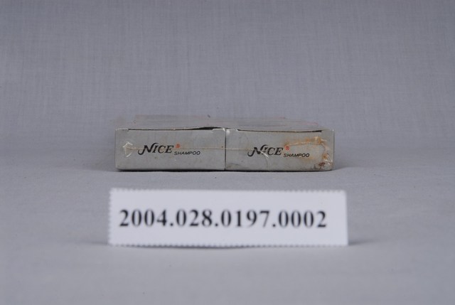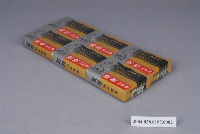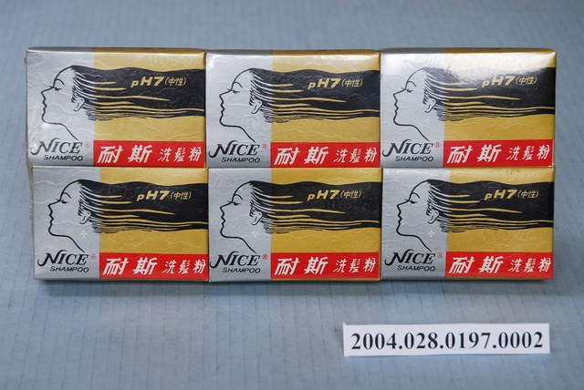 本文物為耐斯洗髮粉,6盒為一組,每盒5小包,盒上封面、側邊都註明中英文字的「耐斯洗髮粉」,圖像部分有位烏黑秀髮的女子,展現女性使用耐斯洗髮粉後的美麗與風采。外盒背面寫有洗髮粉的優點、使用方法以及產品資訊,強調為中性洗髮粉,能去除頭皮屑,並保持頭髮光澤性,是當時重要的民生用品。