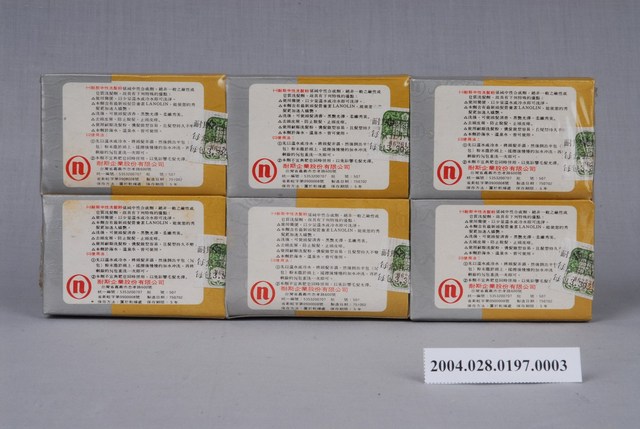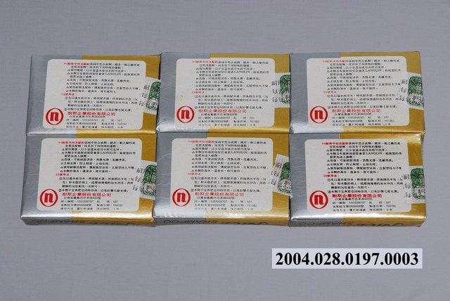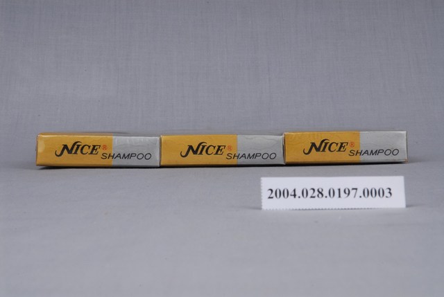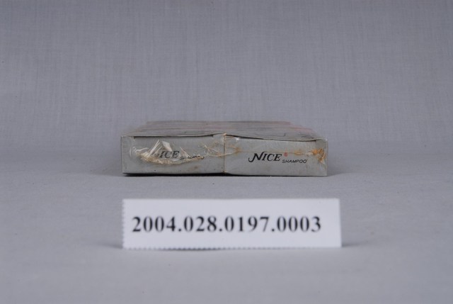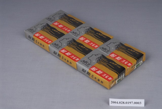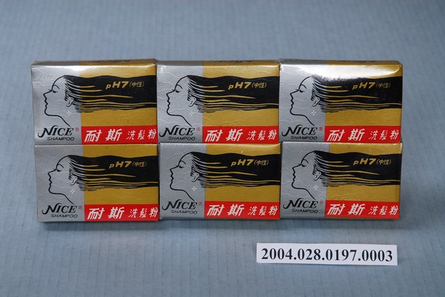 本文物為耐斯洗髮粉,6盒為一組,每盒5小包,盒上封面、側邊都註明中英文字的「耐斯洗髮粉」,圖像部分有位烏黑秀髮的女子,展現女性使用耐斯洗髮粉後的美麗與風采。外盒背面寫有洗髮粉的優點、使用方法以及產品資訊,強調為中性洗髮粉,能去除頭皮屑,並保持頭髮光澤性,是當時重要的民生用品。