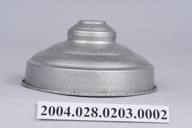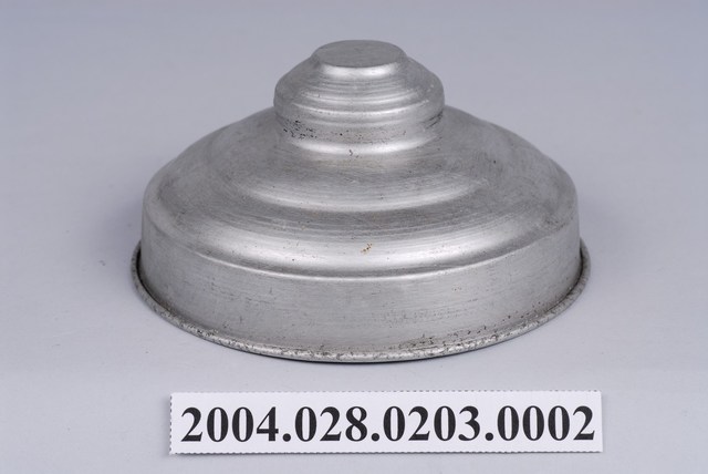 此件糖果罐蓋由鋁質一體成形製成,整體呈圓錐型,蓋紐為半圓形突起,頂平,直徑約占整個蓋面直徑三分之一寬,外圈飾以兩層同心圓微凸造型,並漸進式向下傾斜,至邊緣垂直向下形成套住玻璃瓶身的部分,蓋緣向外反摺呈滾邊。