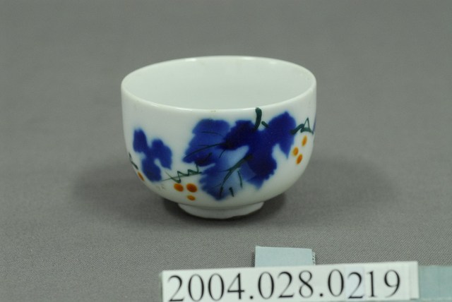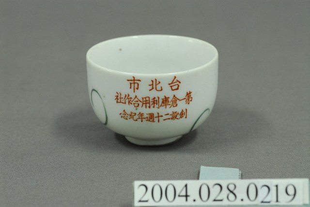 1.本物件為臺北市第一倉庫利用合作社,這個杯子大約7.5公分大小,高約5公分,除了杯子本身之外,並無附有茶杯蓋,杯身上有紅文字「台北市第一倉庫利用合作社創設十二週年紀念」,應是為了週年紀念而特製之紀念杯。杯子本身正面為文字,背面為藍葉紅花圖樣。整體瓷杯屬於敞口短圈足式。小瓷杯本身保存良好,屬於白釉。