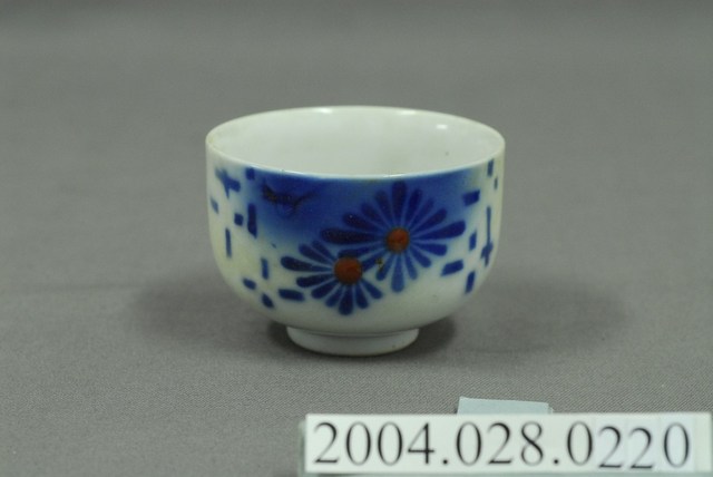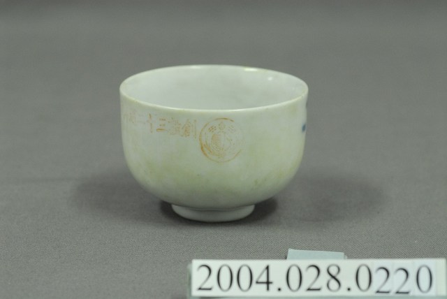1.本物件為1952年萬丹鄉農會贈紀念小瓷杯,這個杯子大約7.5公分大小,高5.2公分,除了杯子本身之外,並無附有茶杯蓋,杯身上有紅文字「創立三十二週年」(其餘看不清)與戳印,整體瓷杯屬於敞口短圈足式。小瓷杯本身保存良好,屬白瓷,但杯身泛黃嚴重。