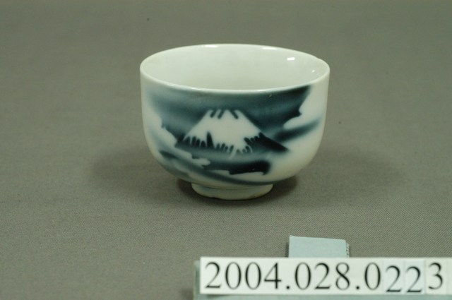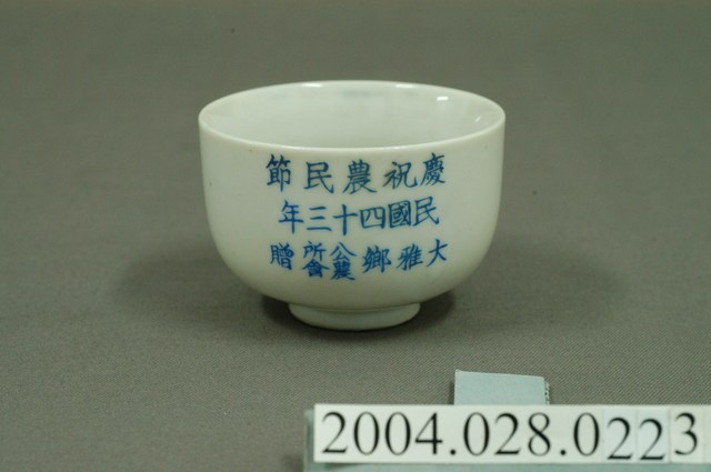 1.本物件為1954年大雅鄉農會與公所贈紀念小瓷杯,這個杯子大約7.5公分大小,高約5.2公分,除了杯子本身之外,並無附有茶杯蓋,杯身正面有藍文字「慶祝農民節 民國四十三年 大雅鄉公所(農會)贈」,背面則為山景圖,整體瓷杯屬於敞口短圈足式。小瓷杯本身保存良好,屬白瓷,有些微泛黃。