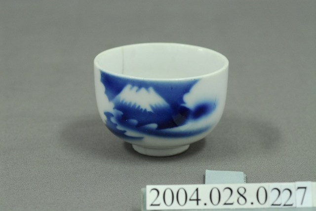 1.本物件為日式花紋小瓷杯,這個杯子大約7.5公分大小,高5公分,除了杯子本身之外,並無附有茶杯蓋,杯身上僅有一些日式花繪,主要以山景當作繪製重點,整體瓷杯屬於敞口短圈足式。小瓷杯本身保存良好,以白瓷為基底。