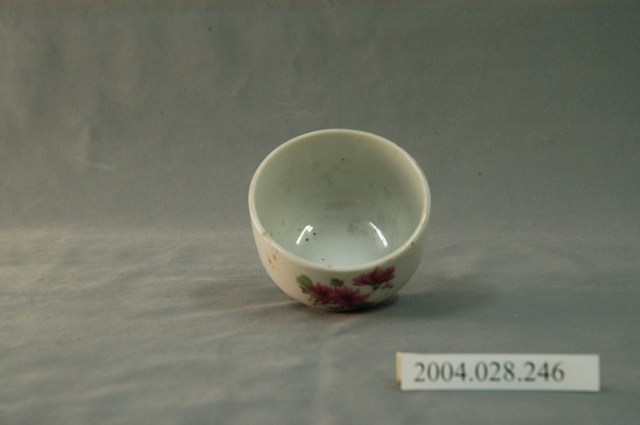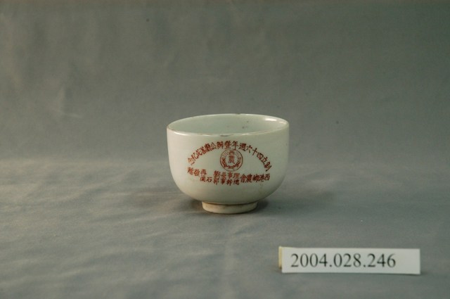 1.本文物為西港鄉農會贈創立四十六週年暨辦公廳落成紀念小瓷杯,這個杯子大約7.5公分大小,高約5.3公分,除了杯子本身之外,並未附有茶杯蓋,杯身在白瓷之上有三朵桃紅花朵圖像,並有文字「創立四十六週年暨辦公廳落成紀念 西港鄉農會理事長劉再總幹事郭石蘭敬贈」,一旁有「西農」徽章。整體瓷杯屬於敞口短圈足式。小瓷杯本身保存良好,有些許髒污,屬白瓷。