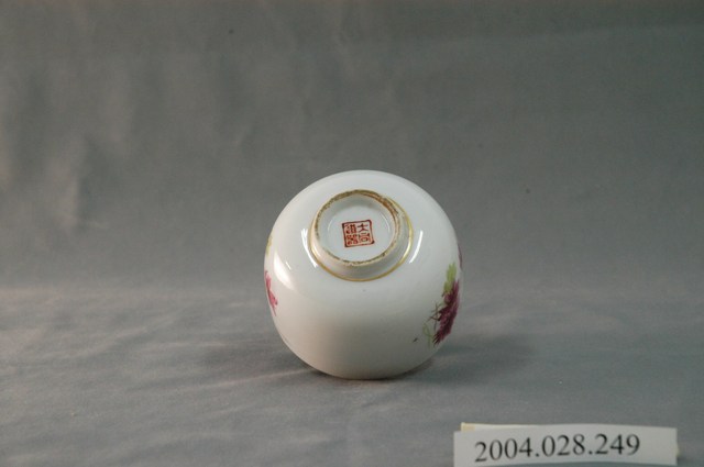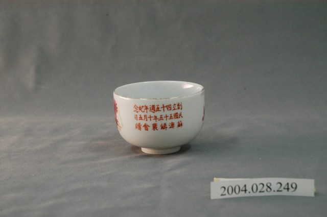 1.本文物為蘇澳鎮農會贈創立四十五週年紀念小瓷杯,這個杯子大約7.5公分大小,高5.2公分,除了杯子本身之外,並未附有茶杯蓋,杯身上有紅文字「創立四十五週年紀念 民國五十五年十月五日 蘇澳鎮農會贈」,圖像則為桃紅色花朵,底部還有文字「大同瓷器」,整體瓷杯屬於敞口短圈足式。小瓷杯本身保存良好,屬白瓷。