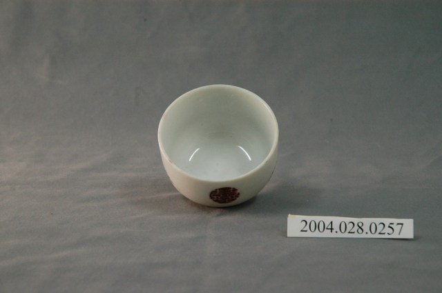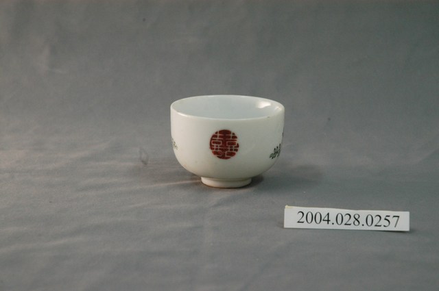 1.本物件為囍字小瓷杯,這個杯子大約7.5公分大小,高約5公分,除了杯子本身之外,並無附有茶杯蓋,杯身有「囍」字,為白色,用紅底做襯,囍字兩旁還有紅色小花,整體瓷杯屬於敞口短圈足式。小瓷杯本身保存良好,屬白瓷。