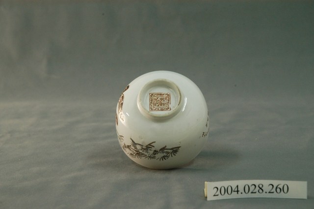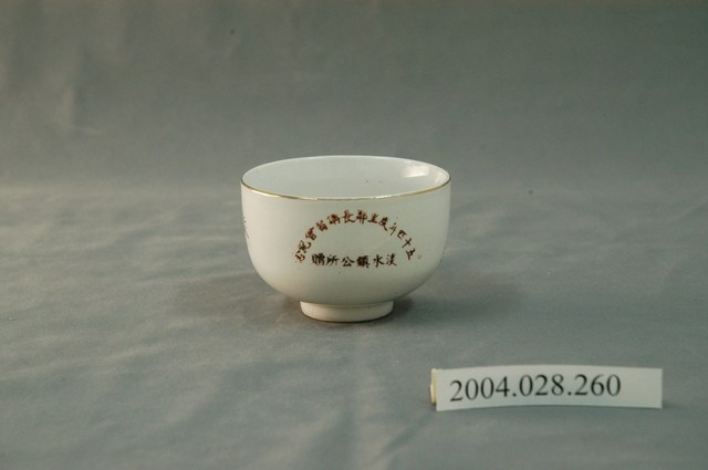 1.本文物為淡水鎮公所贈鄰長講習會紀念小瓷杯,這個杯子大約7.6公分大小,高約5.1公分,除了杯子本身之外,並未附有茶杯蓋,杯身有紅文字「五十四年度里鄰長講習會紀念 淡水鎮公所贈」,還有大大的「壽」字,一旁有葉草花紋,杯緣有一金色線條。整體瓷杯屬於敞口短圈足式。小瓷杯本身保存良好,屬白瓷。