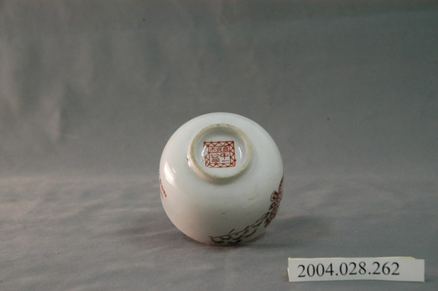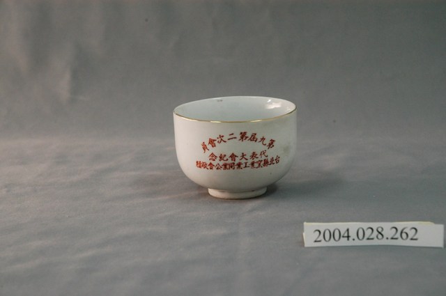 1.本文物為臺北縣窯業工業同業公會贈第九屆第二次會員代表大會紀念小瓷杯,這個杯子大約7.3公分大小,高約5.1公分,除了杯子本身之外,並未附有茶杯蓋,杯身有紅文字「第九屆第二次會員代表大會 代表大會紀念 臺北縣窯業工業同業公會敬贈」,還有大大的「壽」字,一旁有葉草花紋,杯底有「臺北市 中一公司」。整體瓷杯屬於敞口短圈足式,小瓷杯本身保存良好,杯緣有一圈金線,屬白瓷。