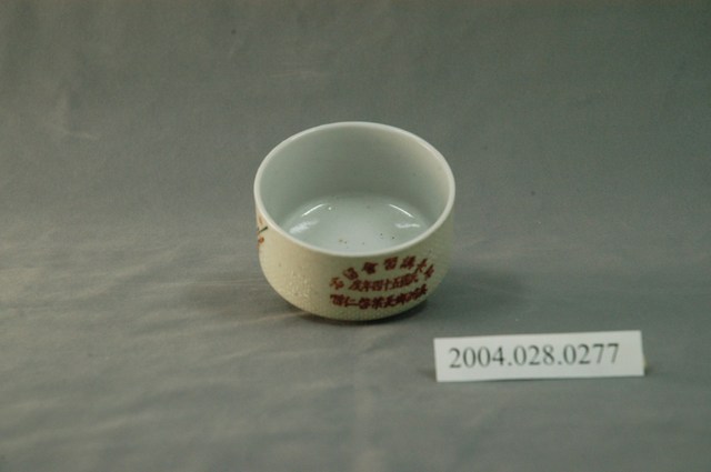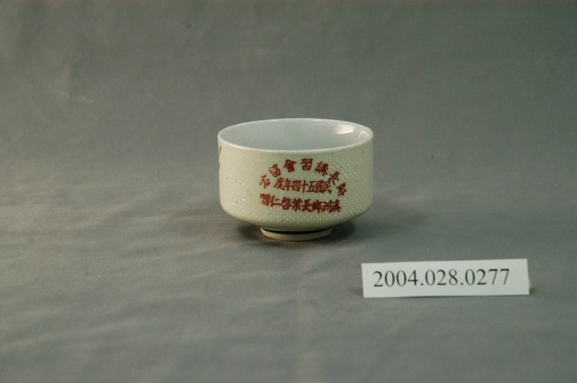 1.本文物為溪洲鄉長葉啟仁贈鄰長講習會留念小瓷杯,這個杯子大約7.5公分大小,高4.9公分,除了杯子本身之外,並未附有茶杯蓋,杯身有文字「鄰長講習會留念 民國五十四年度 溪洲鄉長葉啟仁贈」,並有白色花瓣圖樣,杯身還有白點佈滿杯身。整體瓷杯屬於敞口短圈足式,小瓷杯本身保存良好,以白瓷為基底。