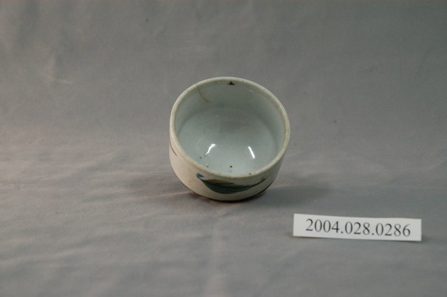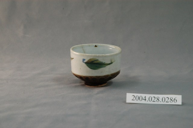 1.本物件為日式花紋小瓷杯,這個杯子大約7.5公分大小,高約5公分,除了杯子本身之外,並無附有茶杯蓋,杯身主體為樹葉,杯子底部為咖啡色,整體瓷杯屬於敞口短圈足式。小瓷杯本身保存良好,屬白瓷,有些微髒污。
