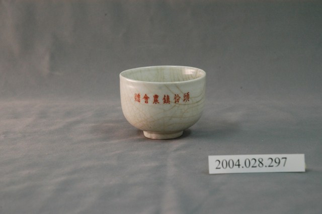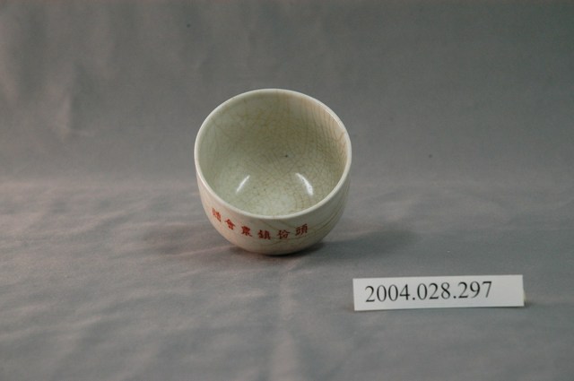 1.本文物為頭份鎮農會贈小瓷杯,這個杯子大約7.3公分大小,高5.5公分,除了杯子本身之外,並未附有茶杯蓋,杯身有紅文字「頭份鎮農會贈」,並有綠葉紅花圖樣,杯身有燒製時保留之痕跡。整體瓷杯屬於敞口短圈足式,小瓷杯本身保存良好,以白瓷為基底。