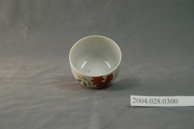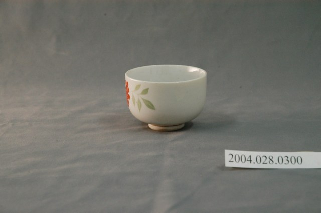 1.本物件為日式花紋小瓷杯,這個杯子大約7.4公分大小,高5.2公分,除了杯子本身之外,並無附有茶杯蓋,杯身上僅有一些日式花繪,這一個主要以葡萄作為裝飾,主要是有紅色果實跟葉面。整體瓷杯屬於敞口短圈足式。小瓷杯型制保存良好,以白瓷為基底,有一些髒污。