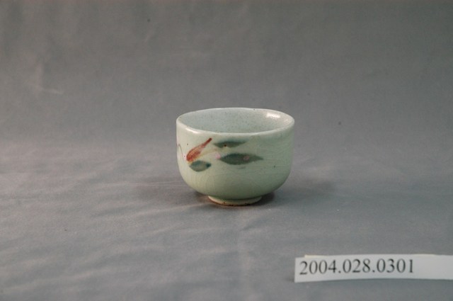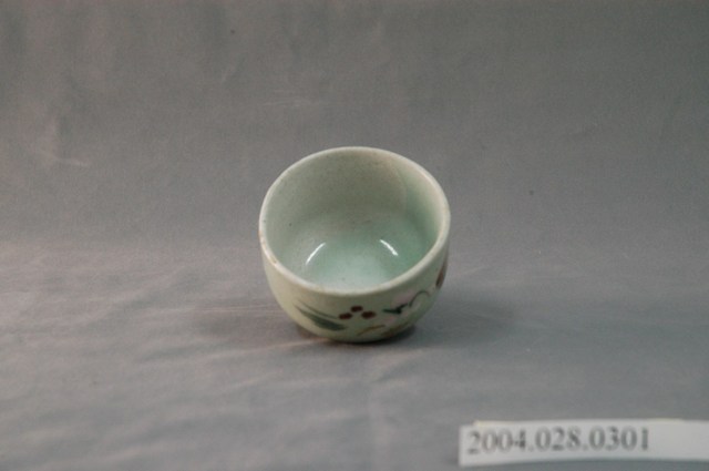 1.本物件為日式花紋小瓷杯,這個杯子大約7.4公分大小,高5公分,除了杯子本身之外,並無附有茶杯蓋,杯身上僅有一些花繪,這一個主要以花作為裝飾,主要是有粉色的花、紅點與葉面。整體瓷杯屬於敞口短圈足式。小瓷杯型制保存良好,以白瓷為基底,並有一些陶瓷燒製時產生的冰裂紋。