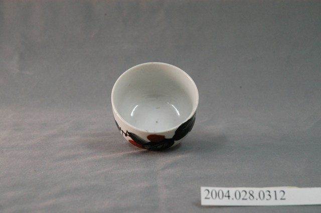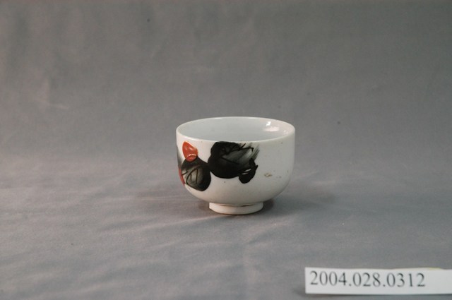1.本物件為樹葉小瓷杯,這個杯子大約7.5公分大小,高約5公分,除了杯子本身之外,並無附有茶杯蓋,杯身主體為樹葉與紅花,整體瓷杯屬於敞口短圈足式。小瓷杯本身保存良好,屬白瓷。