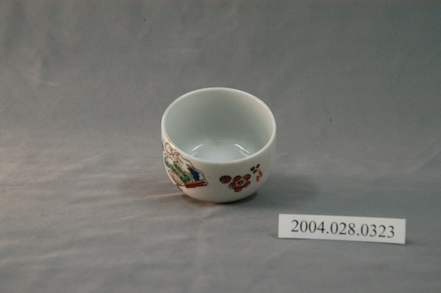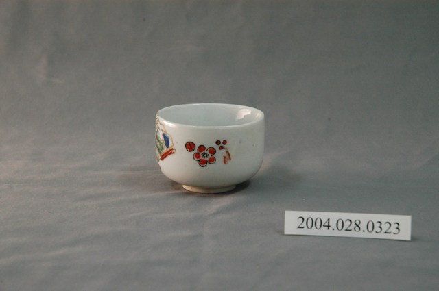 1.本文物為日式花紋小瓷杯,這個杯子大約7.5公分大小,高約5公分,除了杯子本身之外,並未附有茶杯蓋,杯身在白瓷之上皆以圖像呈現,如風景仙鶴扇子與梅花。整體瓷杯屬於敞口短圈足式。小瓷杯本身保存良好,杯底有髒污,屬白瓷。