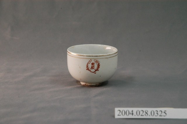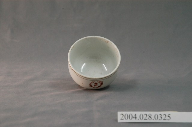 1.本文物為大甲鎮農會贈小瓷杯,這個杯子大約7.5公分大小,高5.2公分,除了杯子本身之外,並未附有茶杯蓋,杯身上有紅文字「大甲鎮農會贈 52」,還有「農」字徽章,除文字之外,還有兩圈紅圈沿杯緣,整體瓷杯屬於敞口短圈足式。小瓷杯本身保存良好,有些微髒污,屬白瓷。