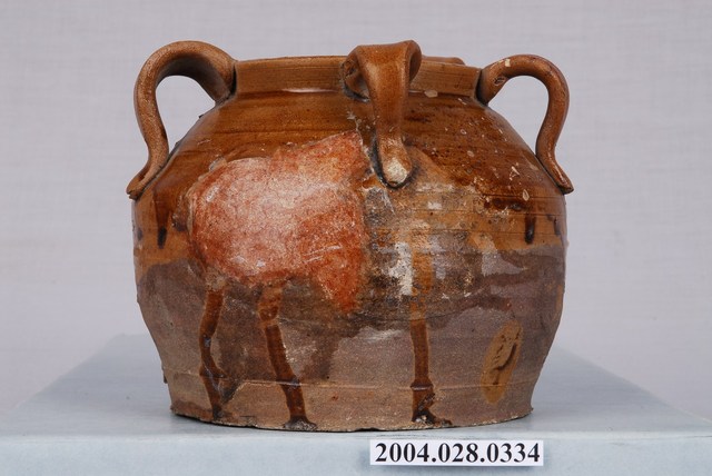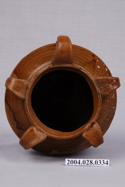 1. 五耳褐釉陶罐,廣口,斜肩,腹部寬大,器身下半向內收斂至底部,底平,器口直立略微外闊。器肩飾有五個繫耳。器腹中央壓印三道單線環狀橫紋,全器施褐色釉,釉厚薄不均,器身下半部及器底露胎,有明顯剝釉和流釉痕跡。2. 陶罐器形與陶甕相似,形制較小且高度與寬度相近,通常用來呈裝油、鹽、糖等用量較少的日用品,常依其用途來命名。