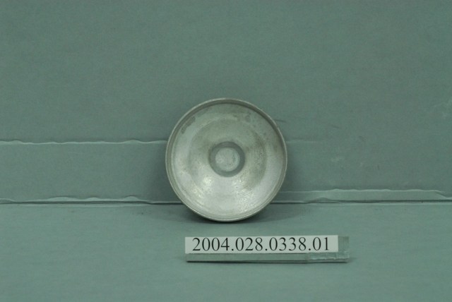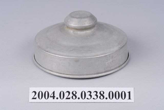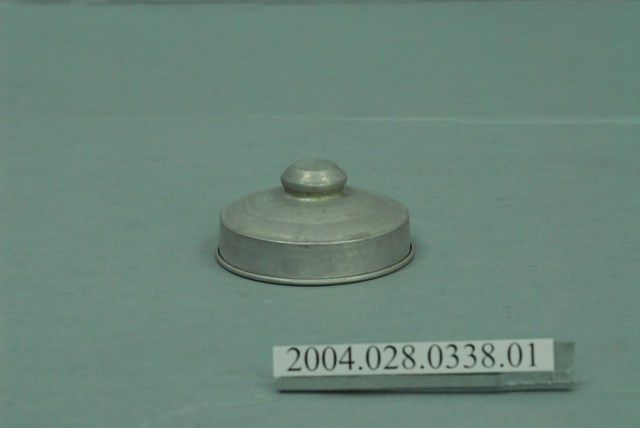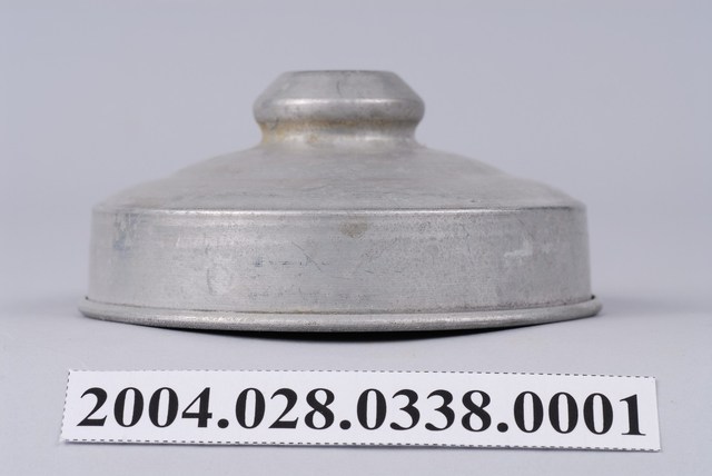 此件糖果罐蓋由鋁質一體成形製成,整體呈圓錐型,蓋紐為半圓形突起,頂平,與蓋面連接處略微內凹,其直徑約占整個蓋面直徑三分之一寬,外圈飾以一層同心圓微凸造型,邊緣垂直向下形成套住玻璃瓶身的部分,蓋緣向外反摺呈滾邊。